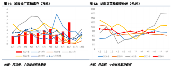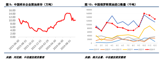 由于9-10月份菜系情绪的相对偏强,导致菜油、菜粕性价比均迅速走弱,菜油库存虽然环比二季度有一定改善,但依然居于高位。另外,来自于俄罗斯的菜油进口压力或在11月得到体现,预计24年四季度俄菜油进口平均进口数量超过13万吨,同比增加2-3万吨左右。